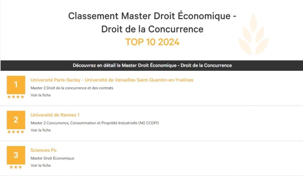 Le Master 2 Concurrence, consommation et droit de la propriété industrielle est fier de vous annoncer qu’il conserve, cette année encore, la deuxième place du classement EDUNIVERSAL des Meilleurs masters, MS et MBA en droit de la concurrence et en droit économique.
