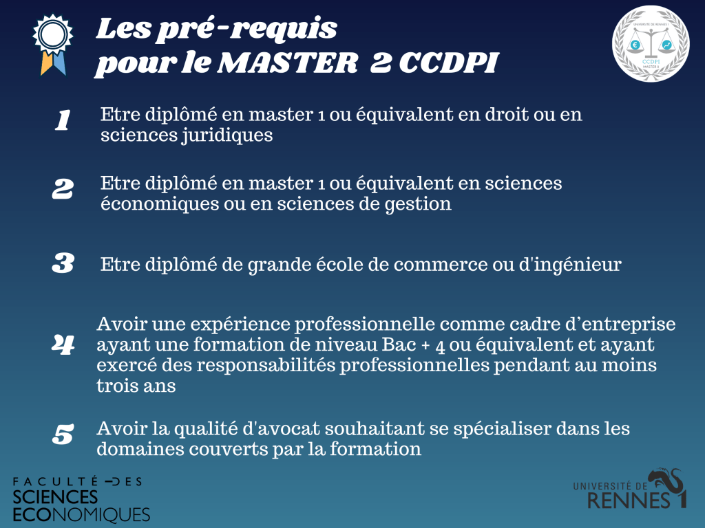 Une fois dans l’espace candidature “e-candidat”, le Master 2 Concurrence, Consommation et Droit de la Propriété Industrielle peut être sélectionné à partir de l’onglet “Faculté des sciences économiques” de l’Université de Rennes.