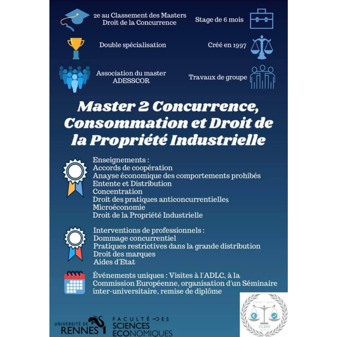 Le Master 2 Concurrence, Consommation, Droit de la Propriété Industrielle est une formation dispensée à la Faculté des Sciences Économiques de l’Université de Rennes. Par sa vision transversale du droit économique, il s’adresse tant aux juristes souhaitant acquérir des compétences économiques permettant de mieux appréhender le droit du marché, qu’aux économistes désireux de comprendre le cadre légal dans lequel les entreprises doivent évoluer.